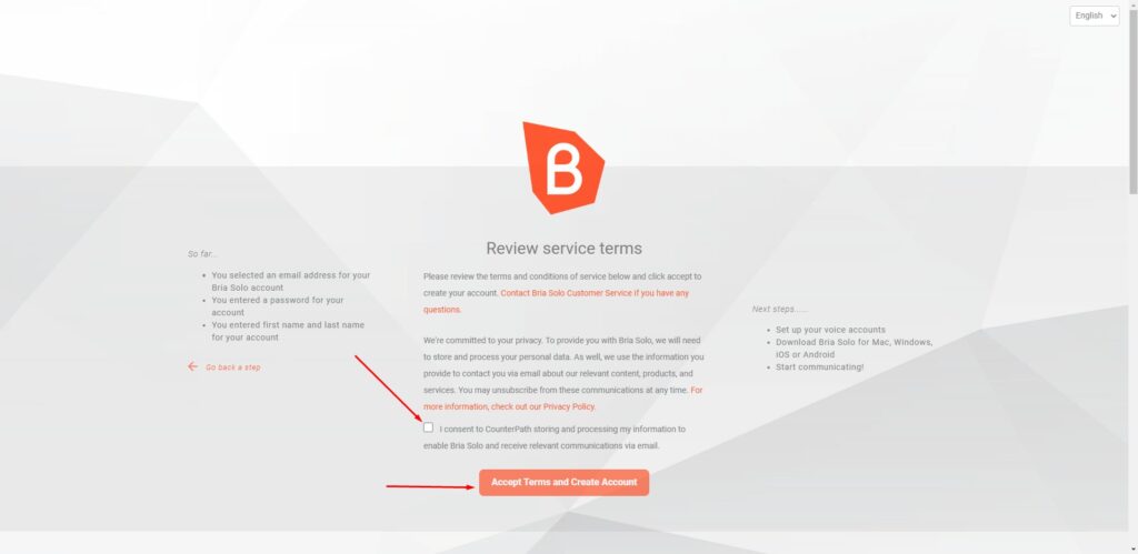 Чтобы настроить мобильное приложение «BRIA SOLO» необходимо перейти по ссылке и создать личный кабинет https://www.counterpath.com/