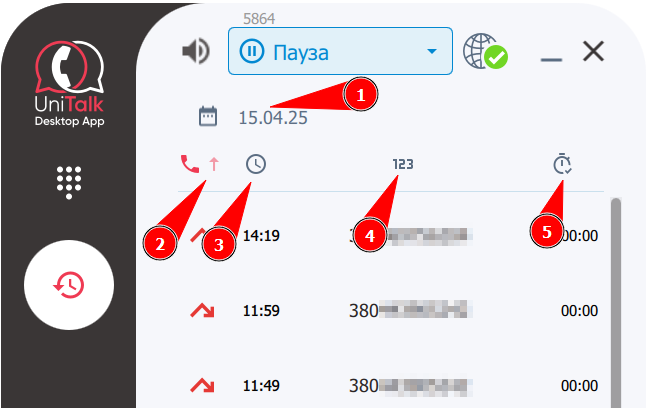В разделе «История звонков» Вы видите следующие элементы: