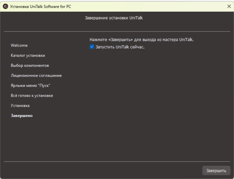 7. Установите галочку «Запустить UniTalk сейчас» и нажмите «Завершить».
