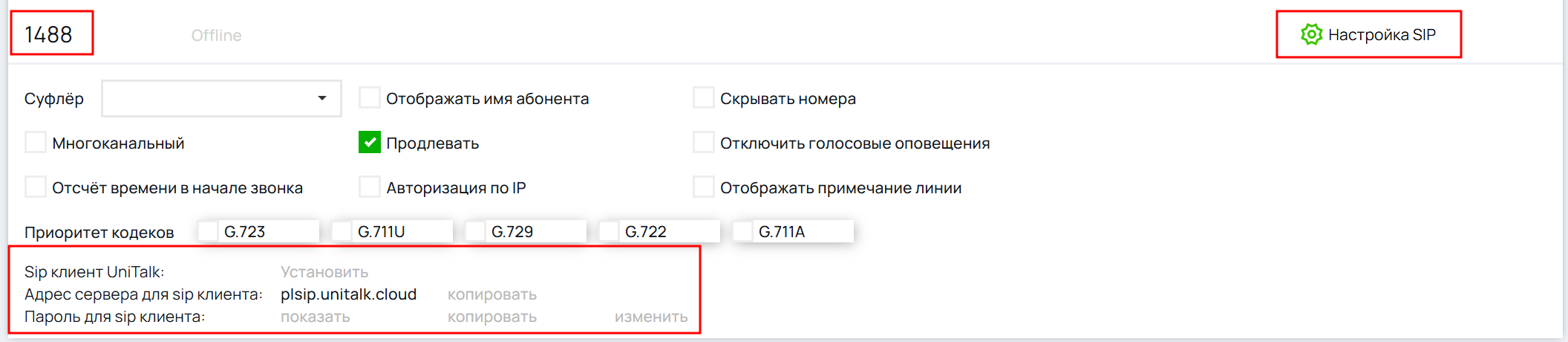 Найти эти данные можно в личном кабинете UniTalk вашего проекта, в разделе «Пользователи». Перейдите в раздел Настройки SIP, и скопируйте данные от рабочего места:
