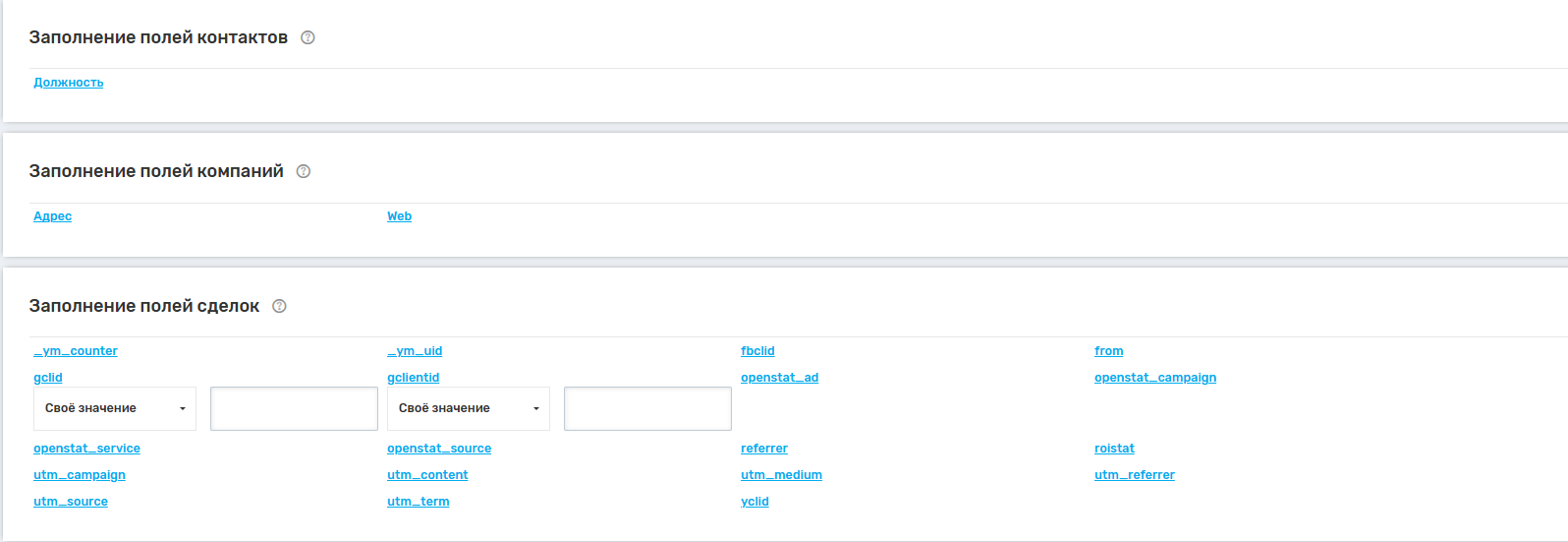 2. Заполнение полей контактов, сделок, лидов