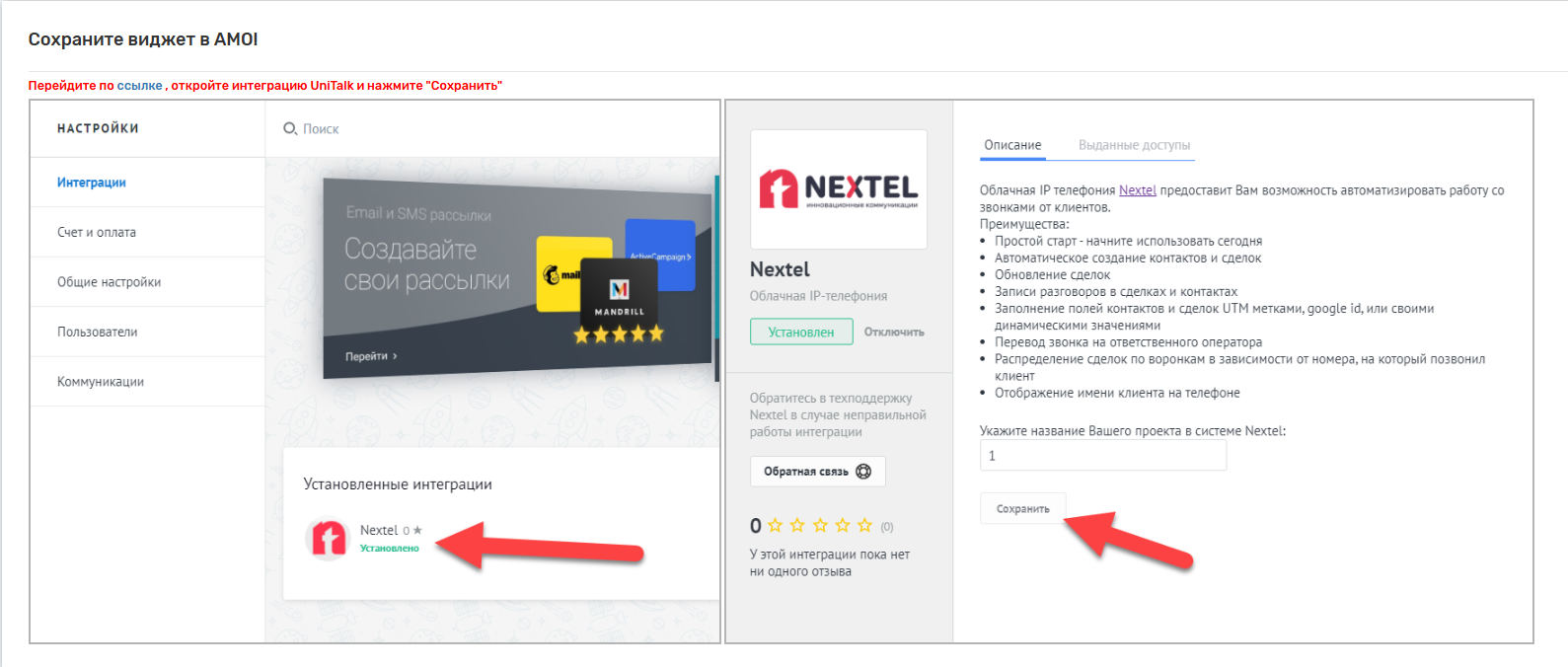 Установка приложения UniTalk из маркета AMO/KOMMO