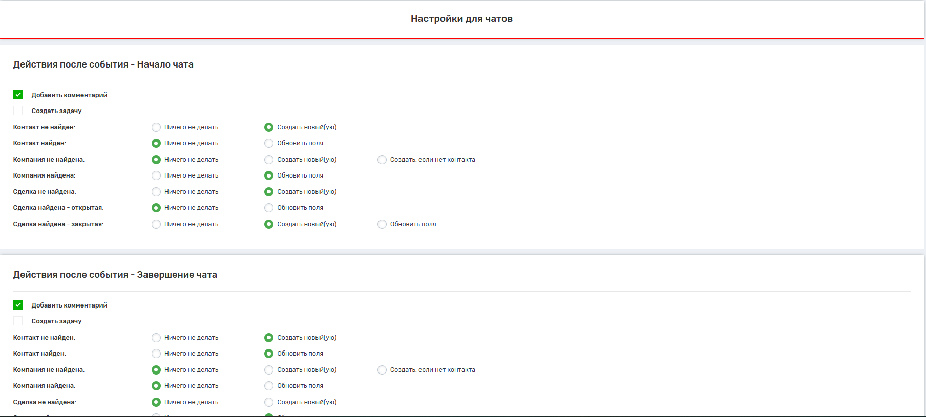 В каждом из этих случаев настраивается, нужно ли создавать комментарии, задачи, а также определяются действия с контактами, сделками и лидами.