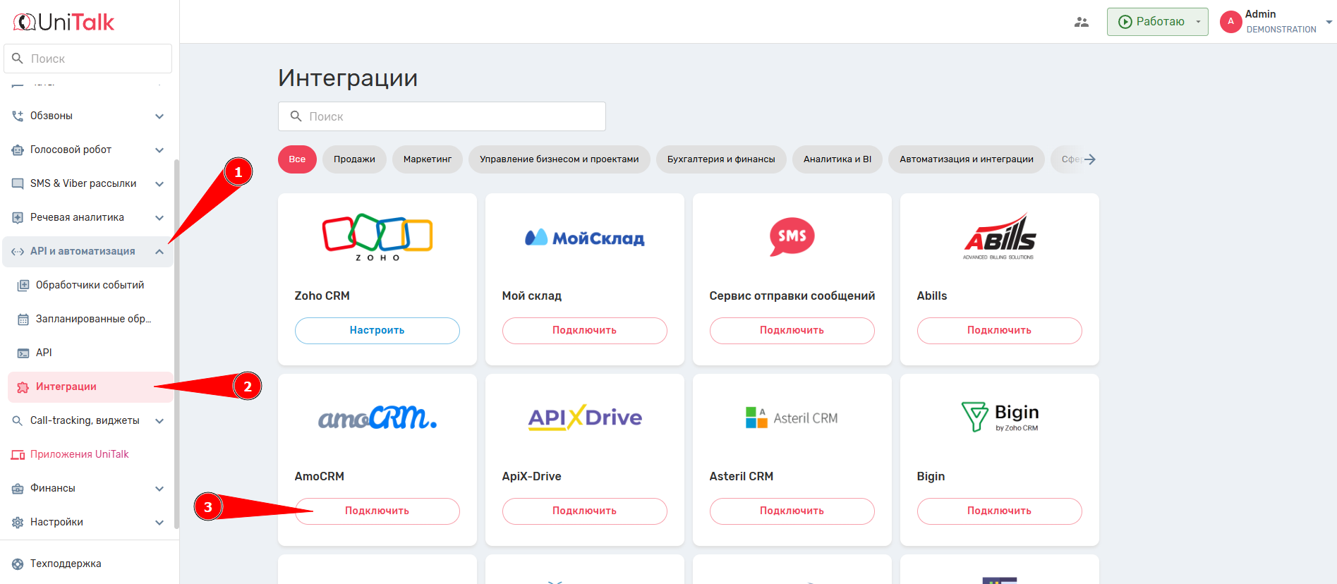 1. В личном кабинете UniTalk перейдите в пункт меню «API и автоматизация» — «Интеграция», затем в пункт меню «AmoCRM».