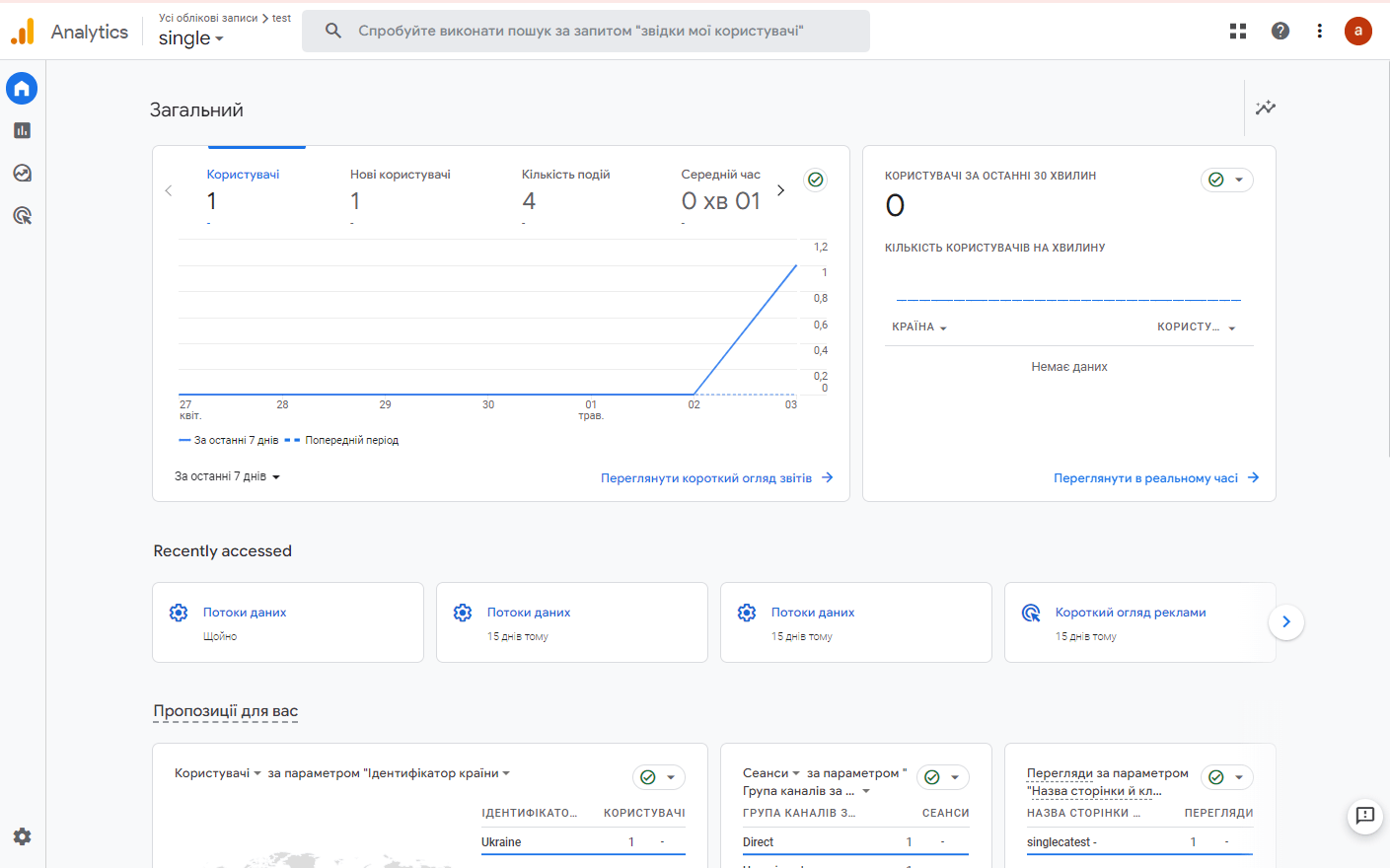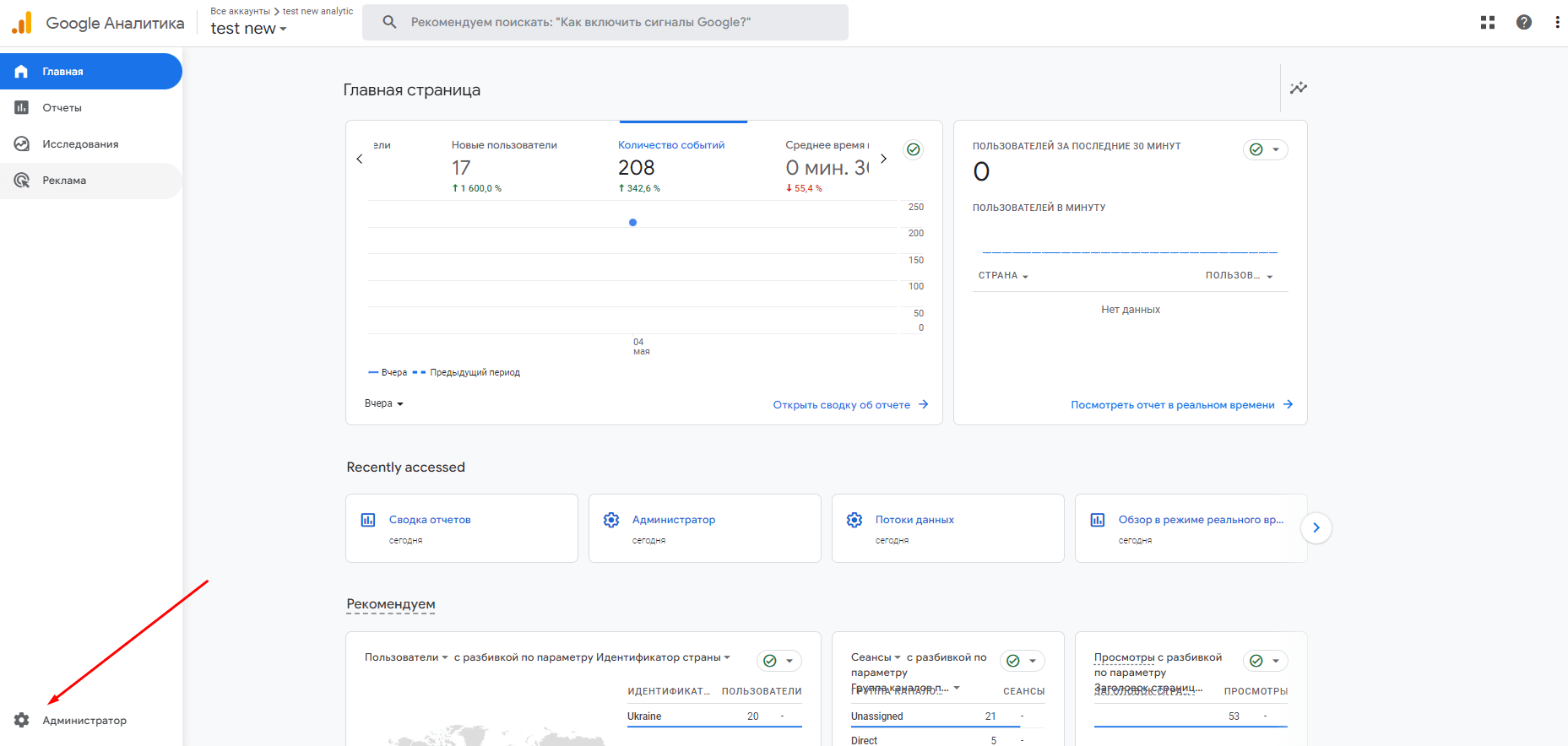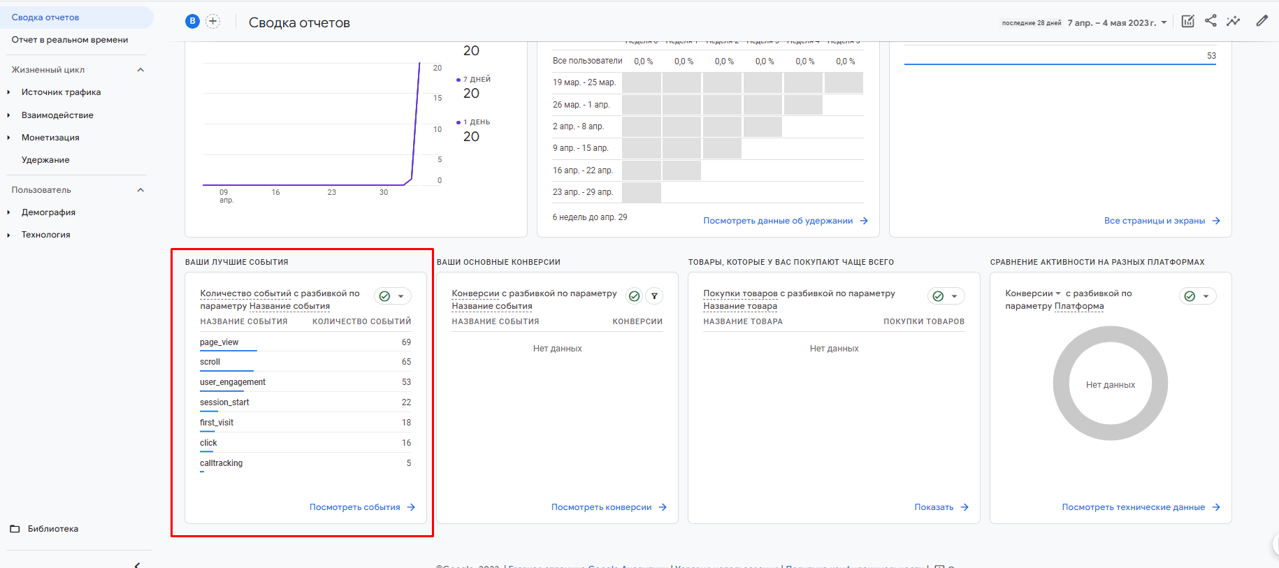 Проверить работу передачи событий можно на странице Google Analytics в блоке “Отчеты”
