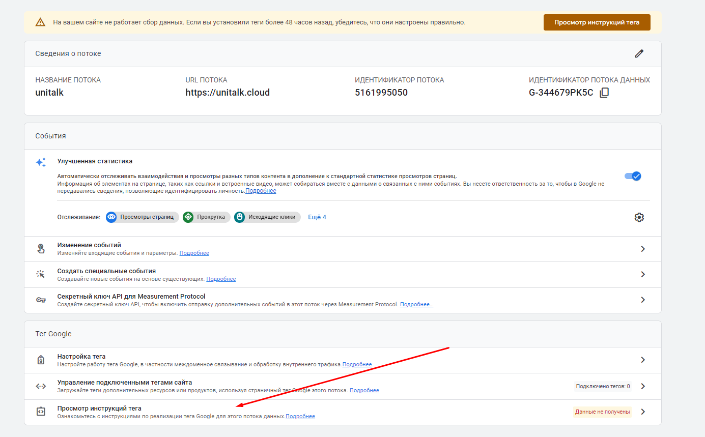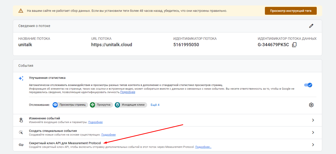 1. настройка на самом сервисе Google Analytics (создание потока данных, подключение и настройка аналитики на необходимом сайте);