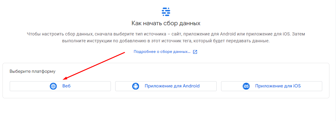 4. Выбрать платформу, на которой необходимо выполнять сбор данных. В данном случае необходимо выбрать Веб, чтобы работать с веб-сайтом