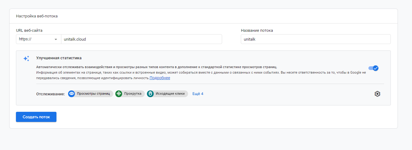 После заполнения необходимых данных, необходимо нажать “Создать поток”