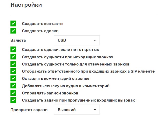 - Для создания задач на перезвон при неотвеченных входящих звонках включите флажок “Создавать задачи при пропущенных входящих вызовах” и укажите приоритет задачи.