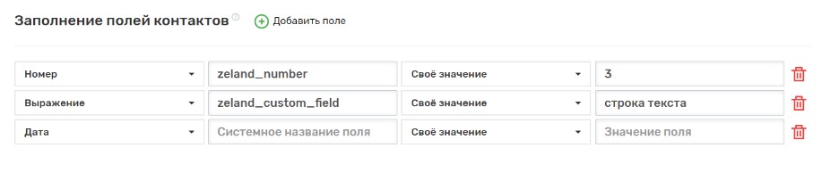 - Заполните поля контактов, которые будут заполняться данными из UniTalk при создании. Для заполнения поля необходимо указать тип поля и его название и задать значение.