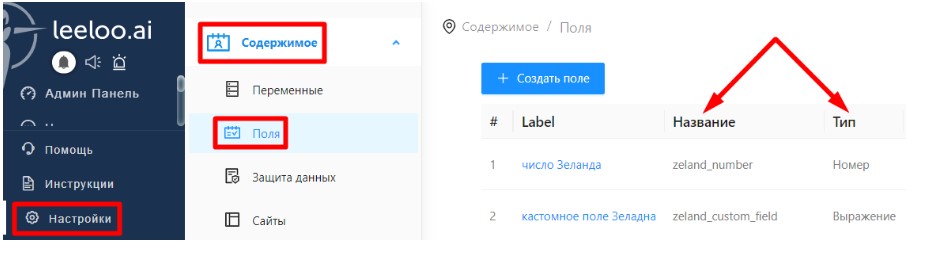 Пользовательские поля указаны в ЛК Leeloo в разделе «Настройки/Содержимое/Поля».