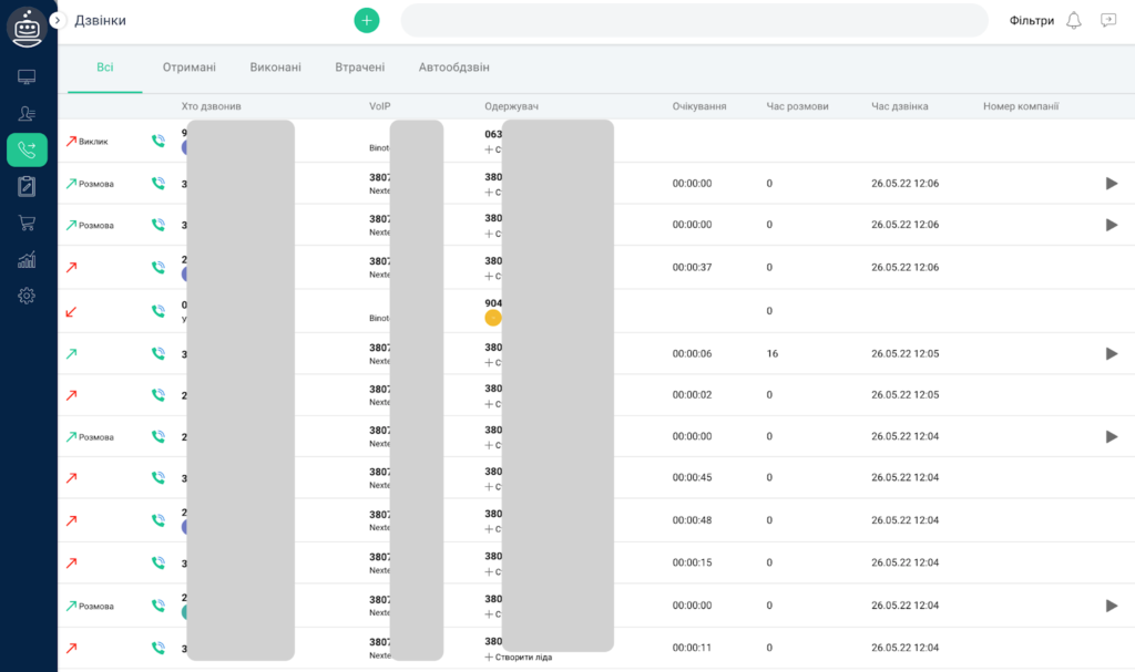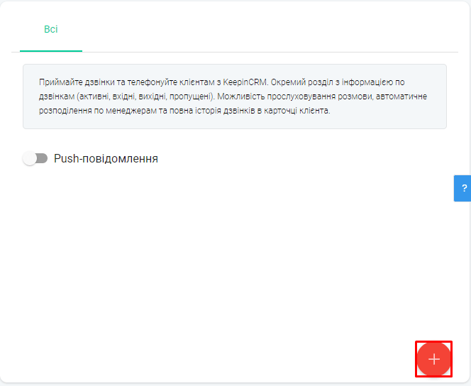 Подключение и настройка интеграции завершена. Информация о звонках передается в KeepinCRM и может быть просмотрена на странице “Дзвінки” .