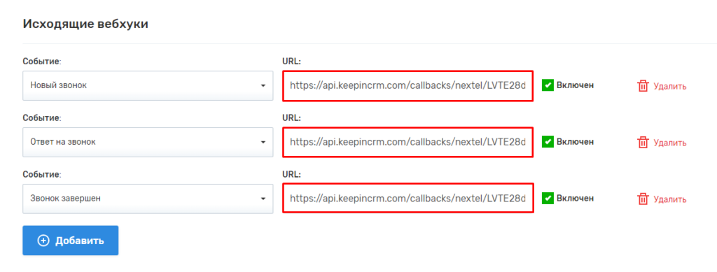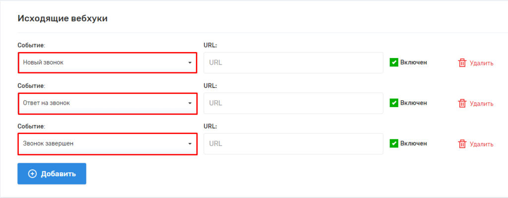 14. Перейти в личный кабинет Unitalk на страницу “API” раздела “Интеграции”, в блоке “Исходящие вебхуки” нажмите кнопку “Добавить” 3 раза, чтобы добавить 3 вида обработки событий;