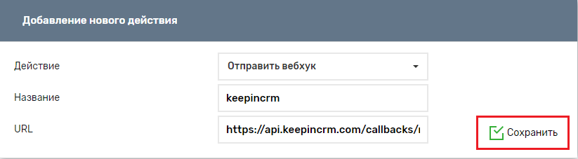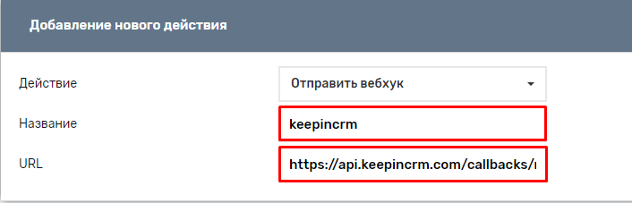 6. В открывшемся блоке “Добавление нового действия” ввести желаемое название в поле “Название” и вставить в поле “URL” ссылку на вебхук, скопированную в пункте 4;