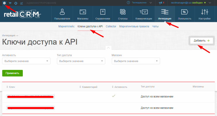 1. Если Вы используете RetailCRM версии 7, то перейдите в кабинете RetailCRM в пункт меню Администрирование — Интеграция — Ключи доступа к API. Нажмите кнопку “Добавить”.