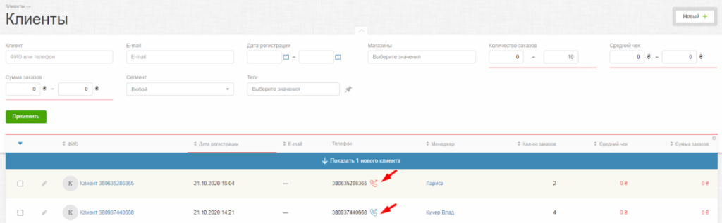 Теперь совершить звонок Вы можете просто нажав на кнопку звонка в списке клиентов или карточке клиента. Внутренняя линия должна быть онлайн и свободна.