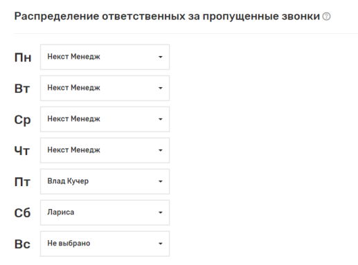 5. Выберите ответственных менеджеров за пропущенные звонки по дням недели. Ответственный будет устанавливаться для карточки клиента при создании при условии, что был пропущенный звонок от нового клиента. Если ответственный не задан, то в карточке клиента при создании будет прочерк.