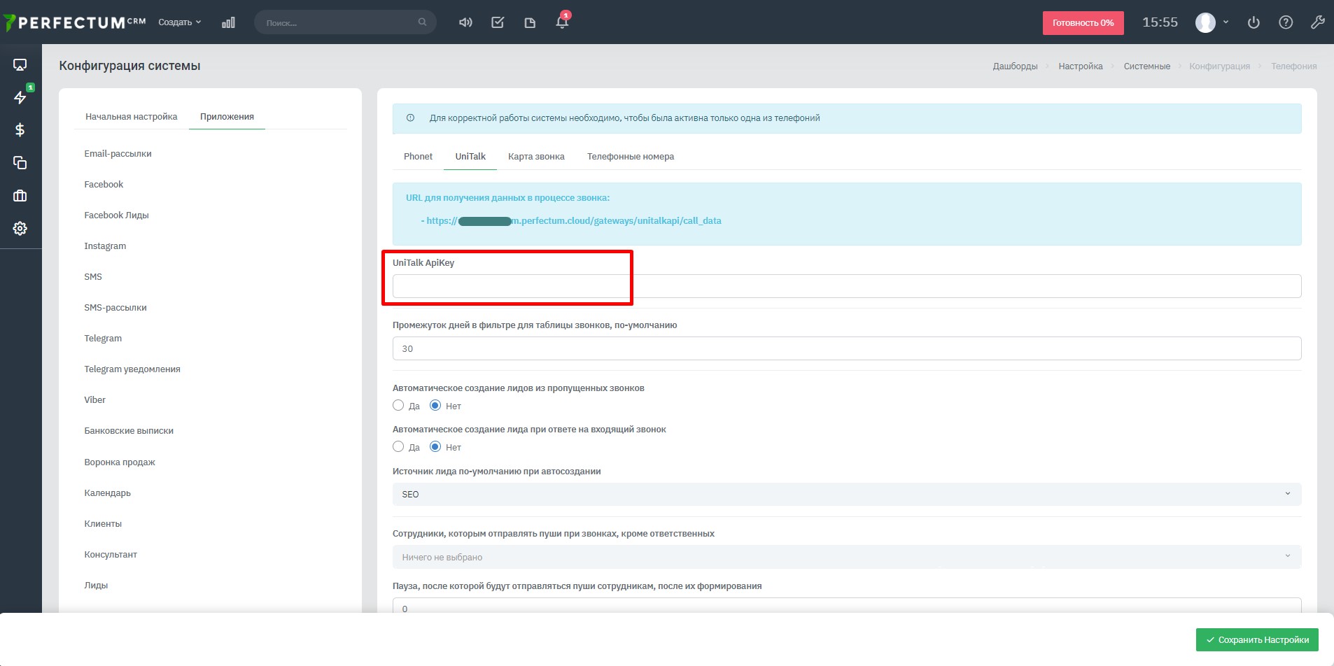 Для настройки интеграции CRM Perfectum с IP-телефонией UniTalk нужно перейти по пути «Настройки — Настройка → Конфигурация → Телефония → Unitalk».
