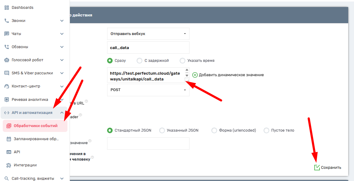 - зайдите в личный кабинет Unitalk и в боковой панели перейдите в раздел «Обработка событий» с помощью раздела «API и автоматизация»