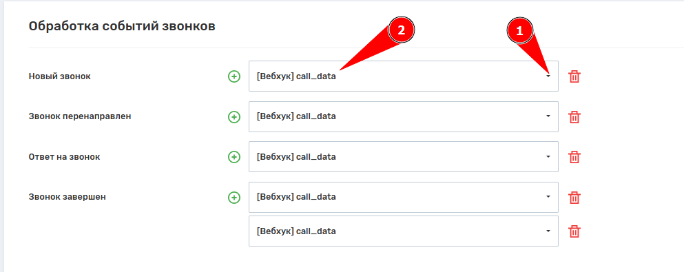 Шаг 4. Далее следует найти раздел «Обработка событий звонков» в разделе API и выбрать ранее созданный вебхук.