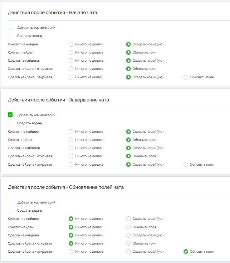 В каждом из этих случаев вы можете настроить создание комментариев, задач на выбранной доске с возможностью указания статуса, а также определить действия с контактами и сделками.