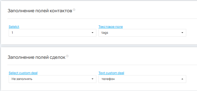 11. Заполните поля контактов и сделок, которые будут заполняться данными из UniTalk при создании. Значение поля типа “Логическое значение” должно быть false — выкл, true — вкл. Значение поля типа “Дата” необходимо вводить в формате 2024-07-12 или 2024-07-12T14:36:16
