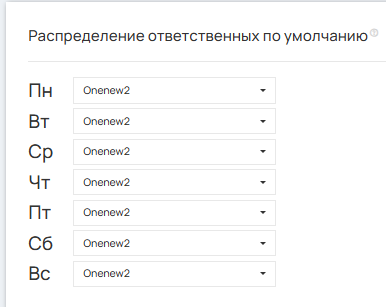 Аналогично настройкам вызовов, вы можете назначить оператора для каждого дня недели. Если по какой-то причине невозможно автоматически определить, кто является ответственным, созданная сущность (контакт или сделка) будет назначена оператору, указанному в этом поле.