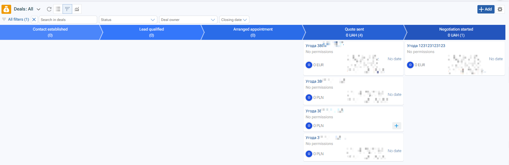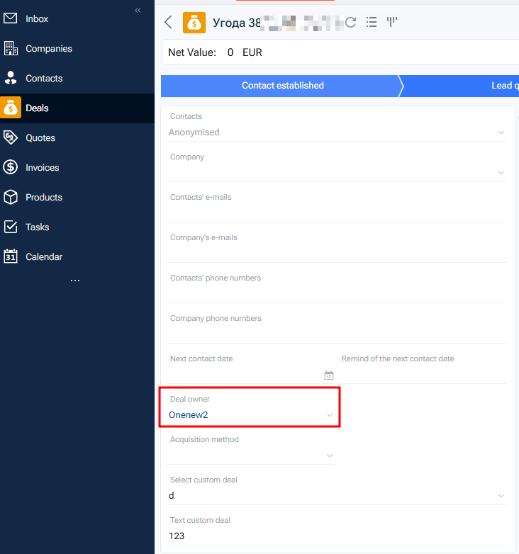 4. При включении флажка “Создавать сделки, если нет открытых” новая сделка будет создана, только если последняя созданная сделка контакта имеет закрытый статус.