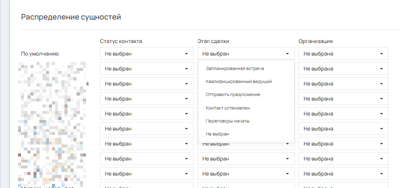 Аналогично настройкам звонков, вы можете распределять сделки по воронкам и выбирать статус, с которым будет создана сделка.