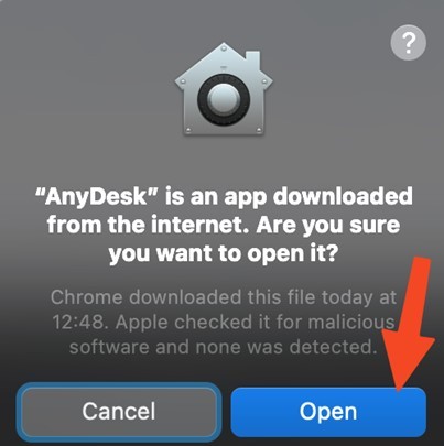 Дважды щелкните приложение AnyDesk, после чего появится окно подтверждения открытия, где следует нажать кнопку “Открыть”: