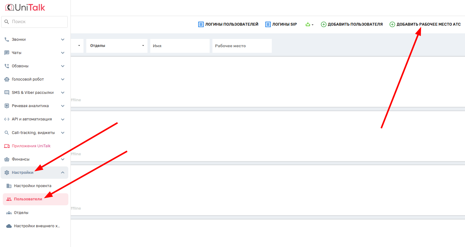 4. В любом случае, что бы вы не подключали, вам нужно будет зайти в раздел меню «Настройки» -> “Пользователи” Личного Кабинета на сайте UniTalk.