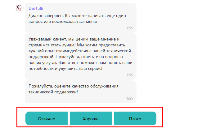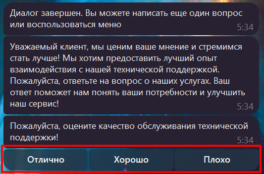 Прекрасно, диалог завершен, также пользователь может оценить качество обслуживания технической поддержки