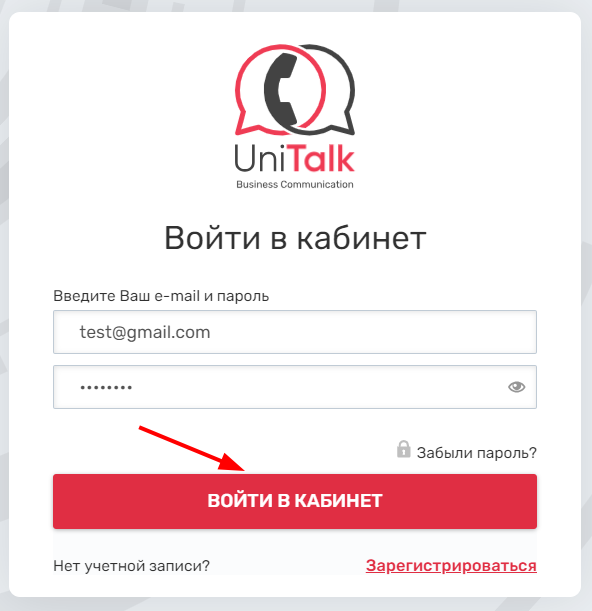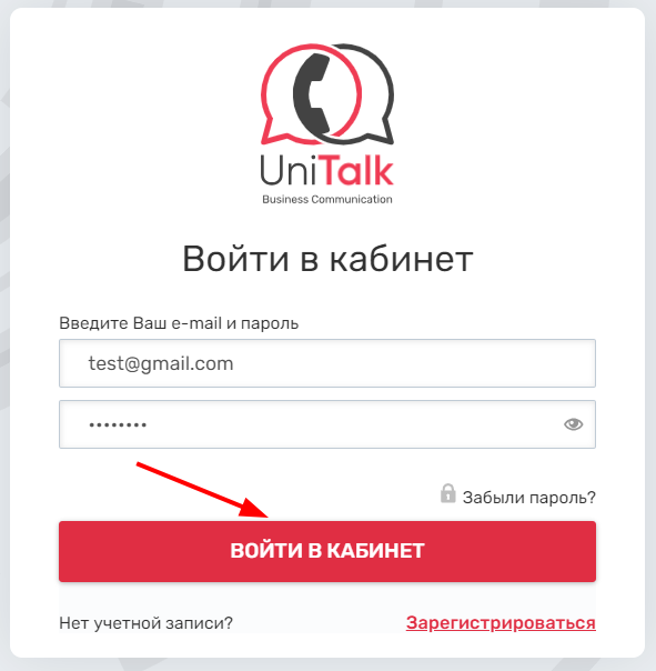Если же пока пользователь не авторизован в личном кабинете UniTalk, произойдет перенаправление на страницу авторизации, в данной форме необходимо ввести электронный адрес и пароль от личного кабинета, после чего необходимо нажать «Войти в кабинет»