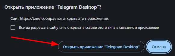 После нажатия откроется страница с предложением открыть приложение Telegram, в диалоговом окне необходимо нажать на кнопку «Открыть приложение Telegram Desktop»