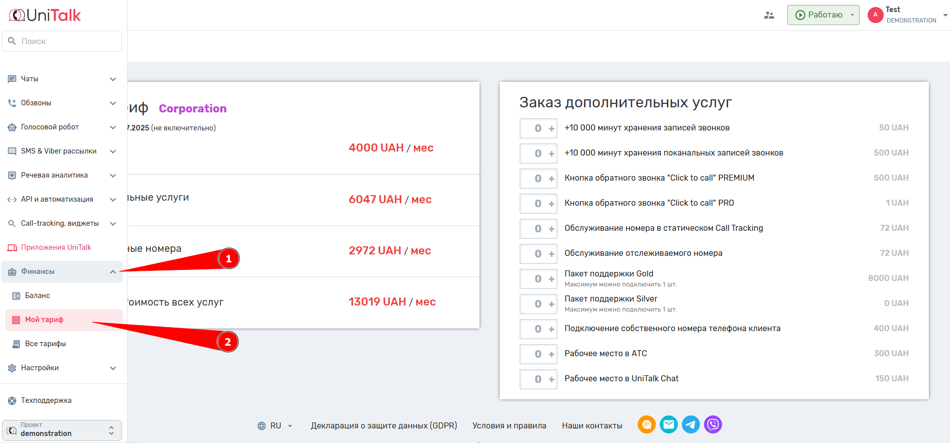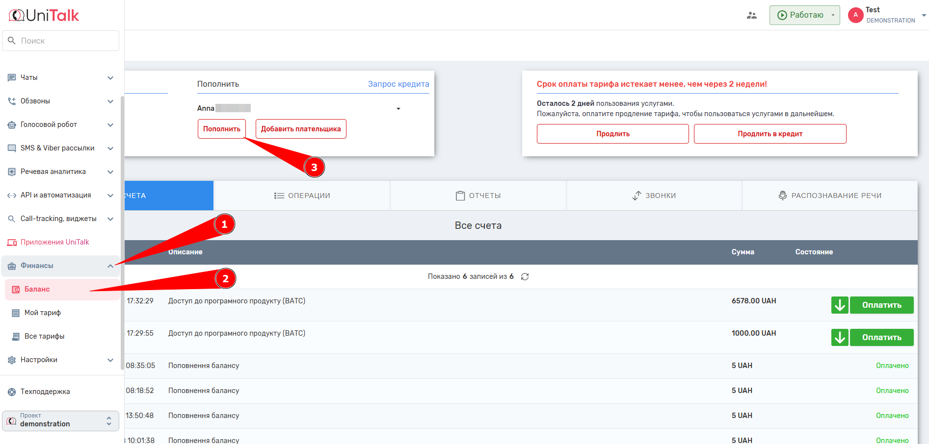 - Для того, чтобы пополнить баланс, необходимо войти в личный кабинет UniTalk и выбрать раздел “Финансы” — “Баланс” — «Пополнить», где Вы можете произвести оплату удобным для Вас способом, прописав сумму платежа, а также выбрав плательщика:
