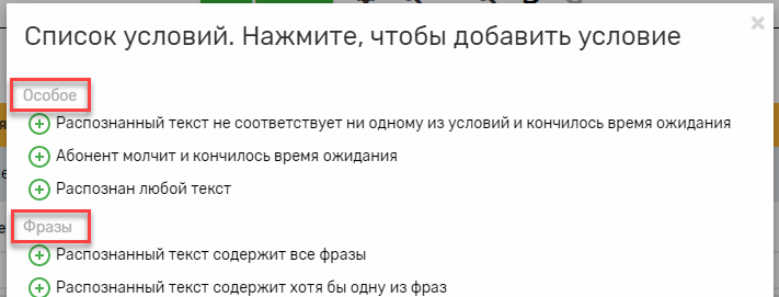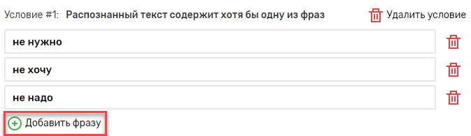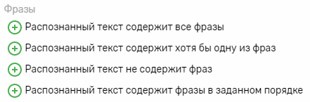 Вы можете указать, какие фразы должен или не должен содержать распознанный текст. Можно указать любое количество фраз (кнопка «Добавить фразу»).