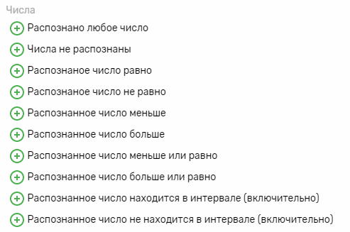Вы можете указать, какие числа должны быть в распознанном тексте. Для условий, кроме «Распознано любое число» и «Числа не распознаны» необходимо указать любое число или числовой промежуток и задать способ выбора числа.
