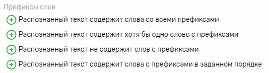 Настройки префиксов указывают, с какими префиксами слова должны или не должны содержаться в распознанном тексте. Можно указывать любое количество префиксов.