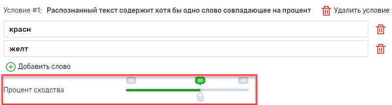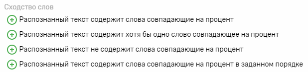 Настройки схожести слов указывают, какие слова должен или не должен содержать распознанный текст, но проверяют не полное совпадение, а насколько слова похожи. Можно указывать любое количество слов (кнопка «Добавить слово»). Кроме слов, надо указать «Процент сходства» — процент, на который должны быть похожи в распознанном тексте и слова, указанные в условии. Например, слова «кора» и «круги» похожи на 75%.