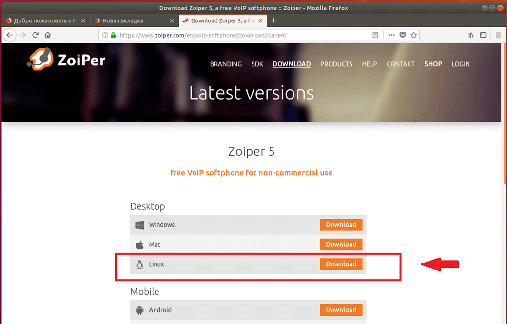 На официальном сайте ZoiPer во вкладке загрузки выбираем версию для Linux и жмем Download.