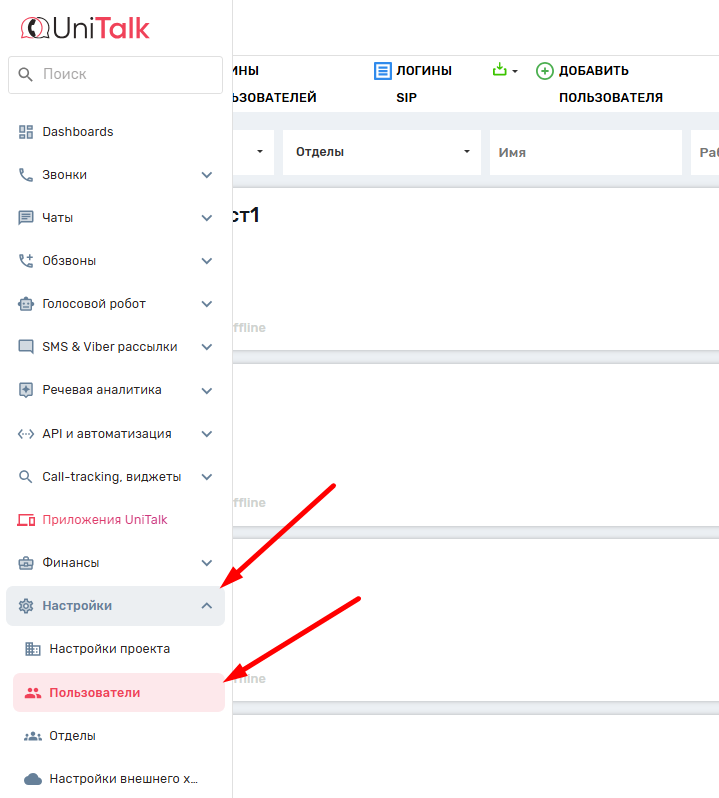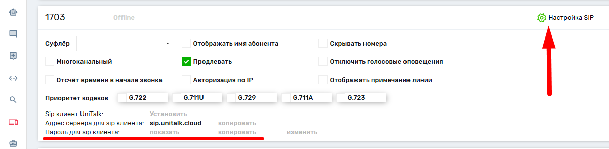 Для продолжения понадобиться логин и пароль для внутренней линии, эту информацию можно получить в личном кабинете пользователя во вкладке “Пользователи” в разделе «Настройки».