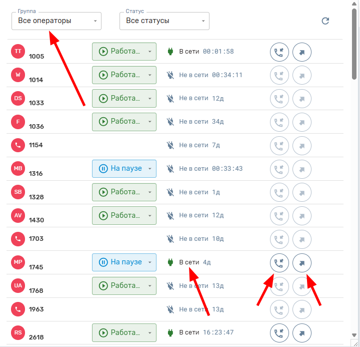 Статус оператора показывает: работает сотрудник в данный момент или нет.