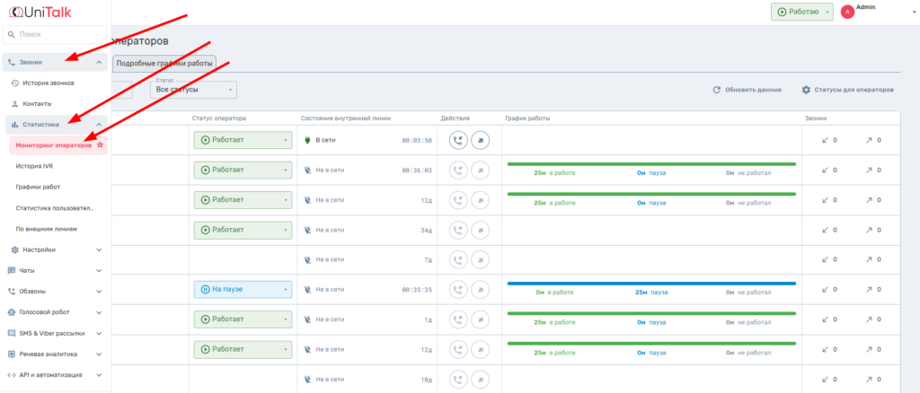 Для более детального мониторинга работы сотрудников Вашей компании, команда UniTalk разработала дополнительный функционал мониторинга операторов. Идеальный инструмент для владельца или руководителя бизнеса, который позволяет в режиме реального времени наблюдать или изменять статусы внутренней линии, статус каждого оператора отдельно и анализировать количество входящих и исходящих звонков.
