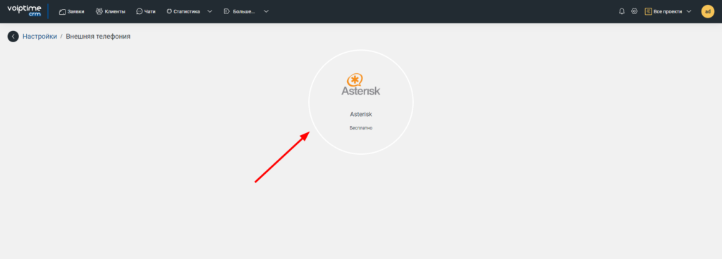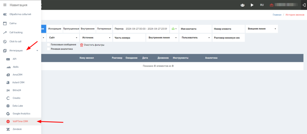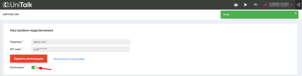 - В личном кабинете UniTalk перейдите в раздел «Интеграция» и выберите VoIPTime CRM.