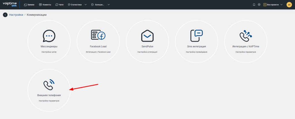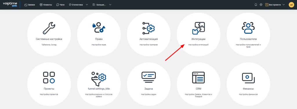 7. Далее настраиваем интеграцию со стороны CRM-системы. Для этого необходимо настроить интеграцию с внешним сервисом телефонии. В личном кабинете VoIPTime CRM в настройках зайдите в раздел «Интеграции».