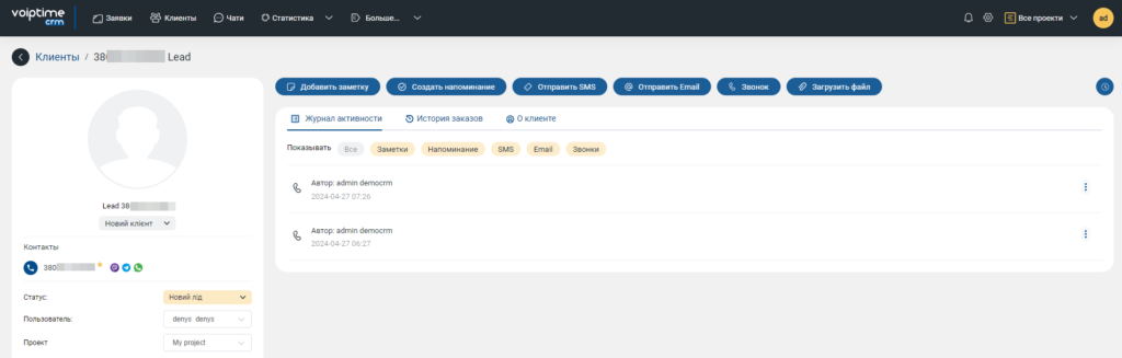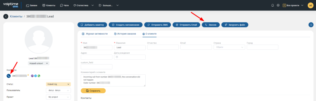 9. Уже можно совершать звонки из CRM. Для этого следует перейти в карточку клиента и нажать на кнопку «Звонок» или пиктограмму возле номера телефона контакта.