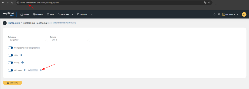 2. В личном кабинете VoIPTime CRM в разделе «Настройки» во вкладке «Системные настройки» скопируйте поддомен CRM-системы и API-токен.
