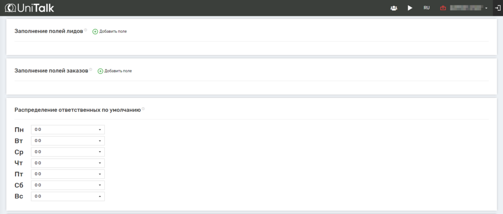 Также можно заполнять поля лидов и заказов, устанавливать ответственных за пропущенные входящие звонки. Это можно сделать, если по каждому дню недели установить ответственного.