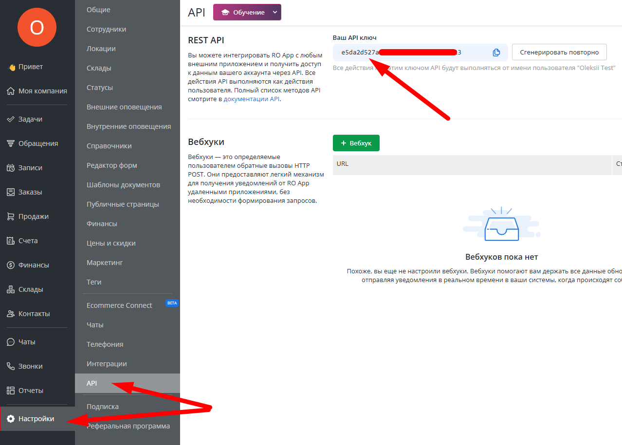 Для настройки интеграции IP-телефонии UniTalk с CRM-системой RO App перейдите по ссылке и в разделе «Настройки» скопируйте ваш API ключ.