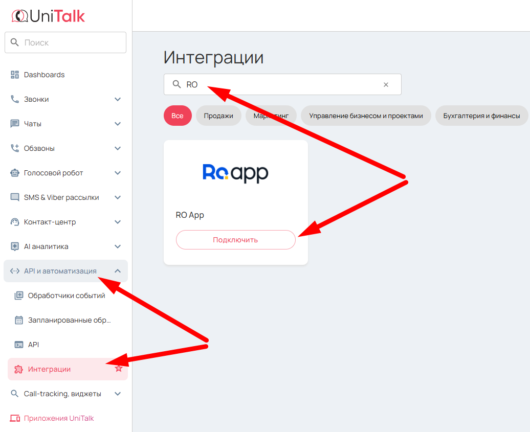 Далее в личном кабинете UniTalk, в разделе «Интеграции», в поле поиска введите «RO App» и нажмите кнопку «Подключить».
